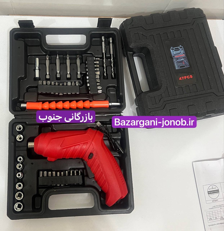 47 عددی آچار بکس ، آچار ستاره ای ، آلن ، پیچ گوشتی دوسو و چهارسو ، مته ، شلنگ خرطومی برای نقاط کور ، کیف حمل 250x40x40 میلیمتر 4.8 ولت 250 دور بر دقیقه راست گرد , چپ گرد امکان چرخش دسته دارای چراغ LED مجزا دارای سری پیچ گوشتی دو سو و چهارسو