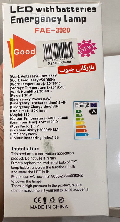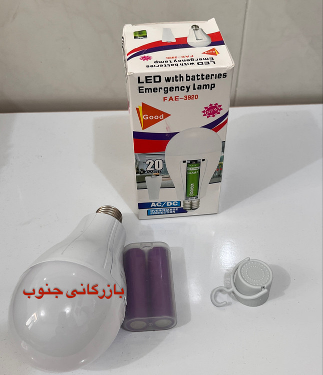 - محتویات: یک عدد لامپ اضطراری، دو عدد باتری لیتیومی 4500 و یک عدد سرپیچ آویز پلاستیکی